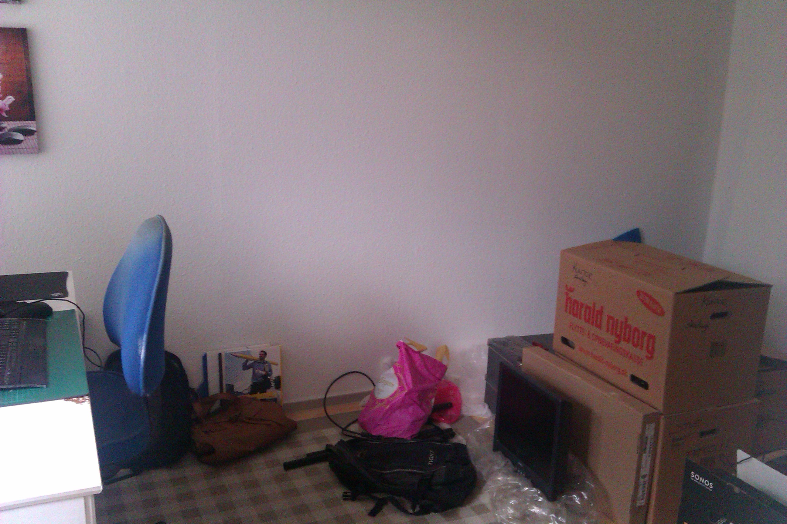 Der er blevet lavet lidt, så jeg kan sidde og skrive her, men hvis jeg troede at her ville være roligt, så tog jeg fejl. Det er ikke rummets skyld at det stadig roder med halvfærdige møbler der mangler et par skruer, flyttekasser og løse tasker, bade – og håndvægte (!) og at der mangler en reol.