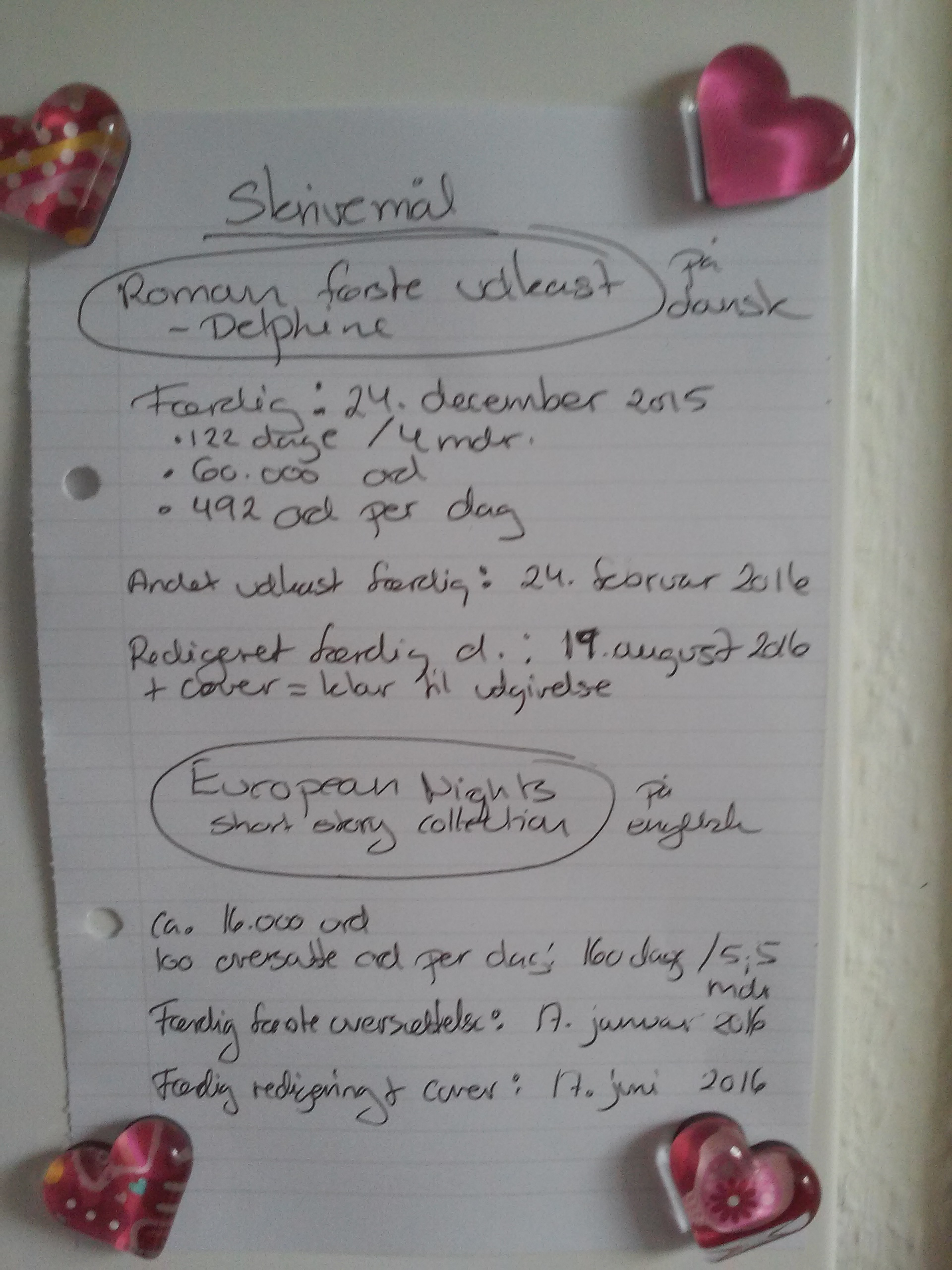 Så besluttede jeg hvor lang den skulle være, 60.000 ord ca. da det er passende for den type historie og genre (kærlighedsroman/ chick-lit) og regnede ud hvor mange ord det ville blive per dag. Altså når jeg havde sat deadline for første udkast (24. dec. 2015 – igen en dato jeg ikke glemmer!)
