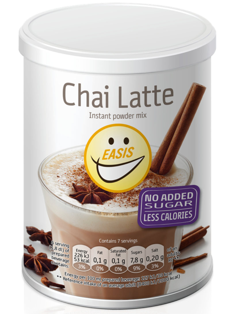 Jeg har dog nogle gange krydret den lidt med Easis nye Chai Latte (3 spsk. Står der på pakken, men det svarer jo til halvdelen af bøtten, så jeg nøjes med 3 tsk. Som gør theen lidt ekstra sød og cremet, hvis det er det den trætte forfatterhjerne trænger til. Man kan også bare drikke Chai Latten alene med kogt vand.