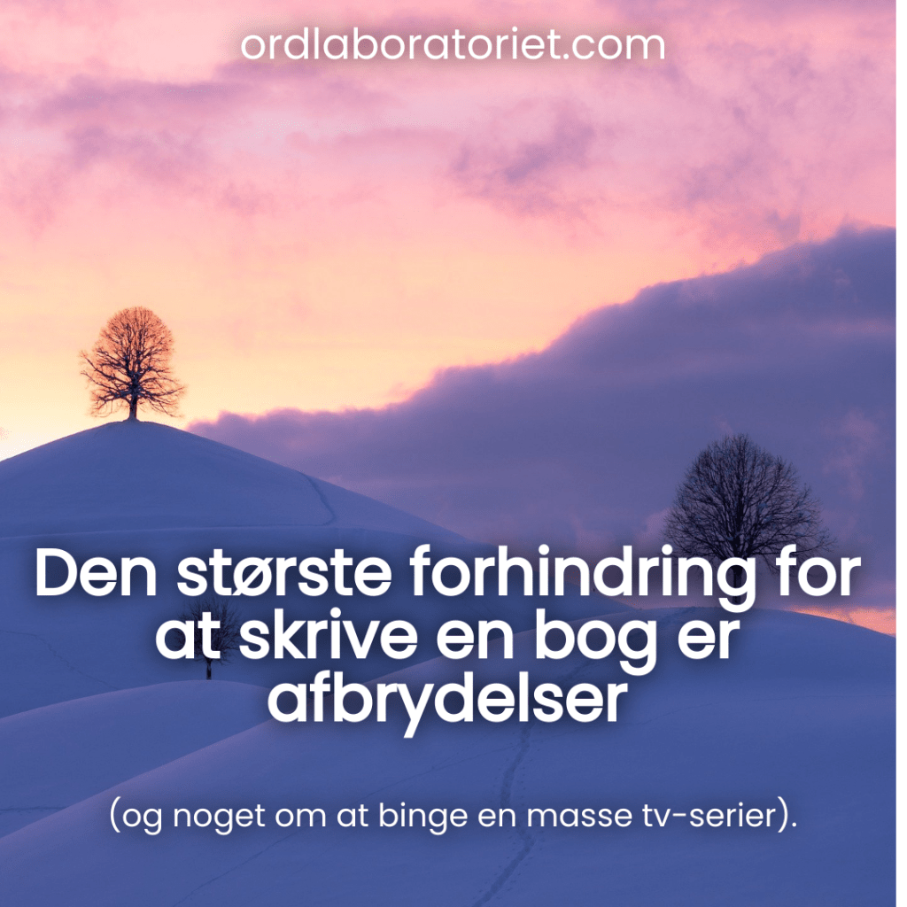Joyce Carol Oates siger i sin Masterclass at den største forhindring for en forfatter er afbrydelser, og jeg kan kun give hende 1000% ret! Jeg skal ikke kede dig med alle de afbrydelser jeg bliver udsat for hver gang jeg sætter mig for at arbejde, men lad os bare sige at jeg drømmer om et stille sommerhus jeg kan tage hen i og skrive mine bøger, så har jeg ikke sagt for meget.