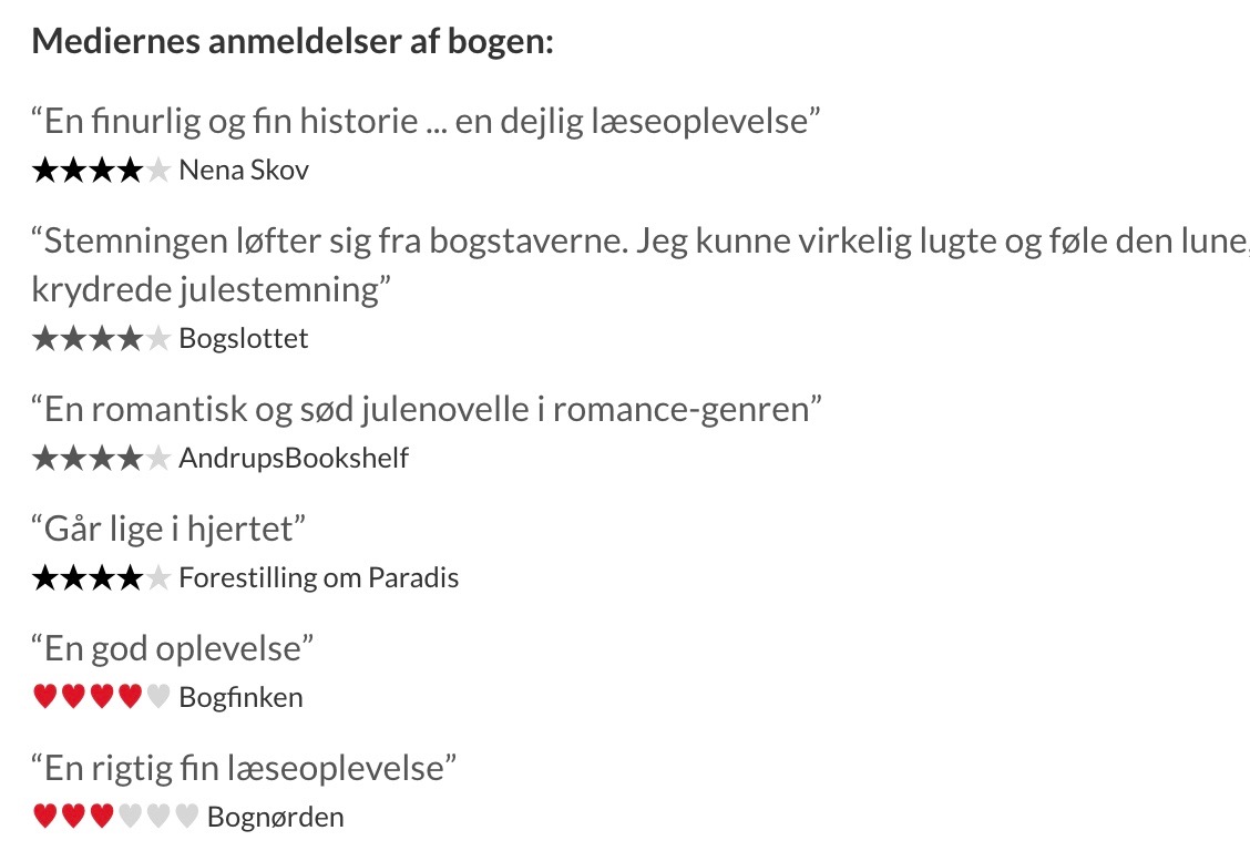Hvor er det dog skønt at læse en julenovelle, som ikke er som mange af de andre bøger og film der læses i december. Det er rart at der et form for hverdags forhold, som skal fikses. Den her bog tager et forhold op, som har varet i fem år. Det er ikke en dans på roser, der er tvivl og skænderier, men det er nu i en smuk forening af skønt beskrevet julebilledee af snevejr og juleaften. Det er virkelig en bog der er værd at læse.